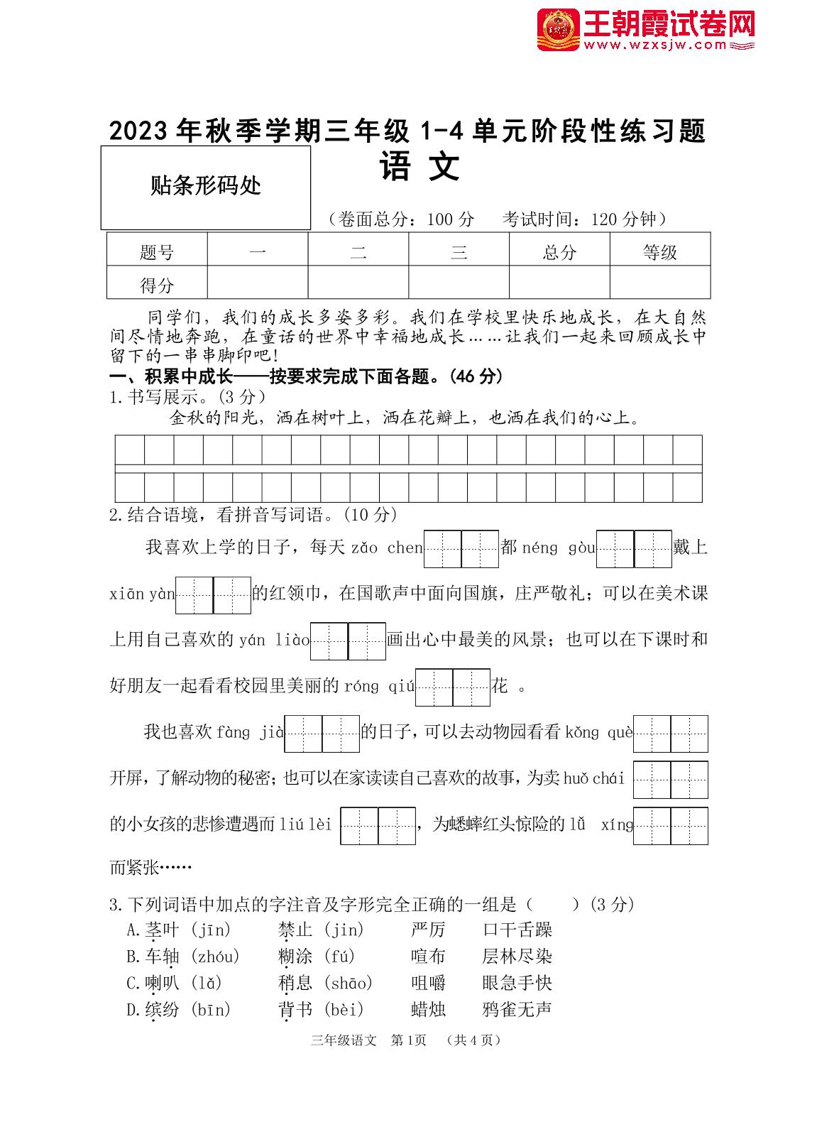 三年级语文人教版上册期中卷