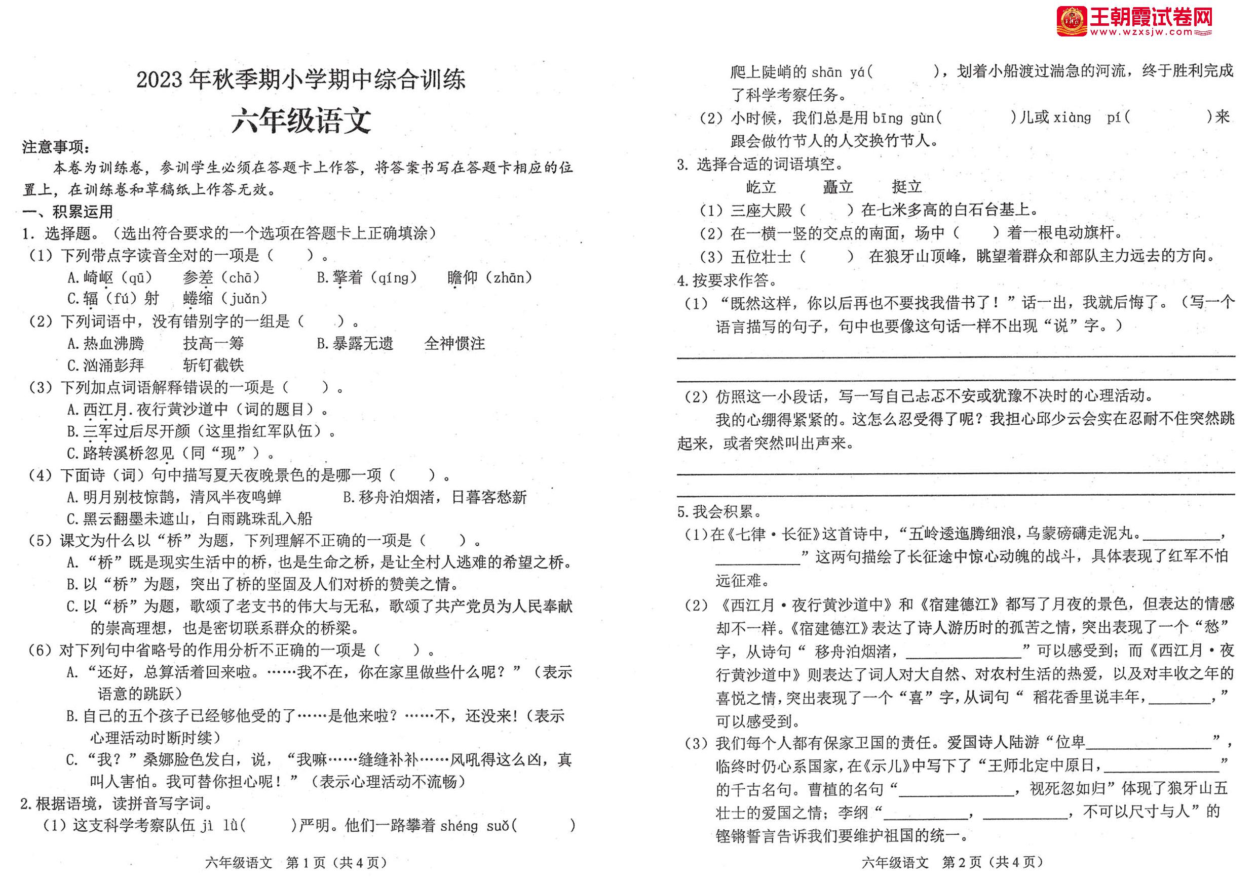 广西玉林市博白县2023-2024学年上学期期中综合训练六年级语文(人教版)