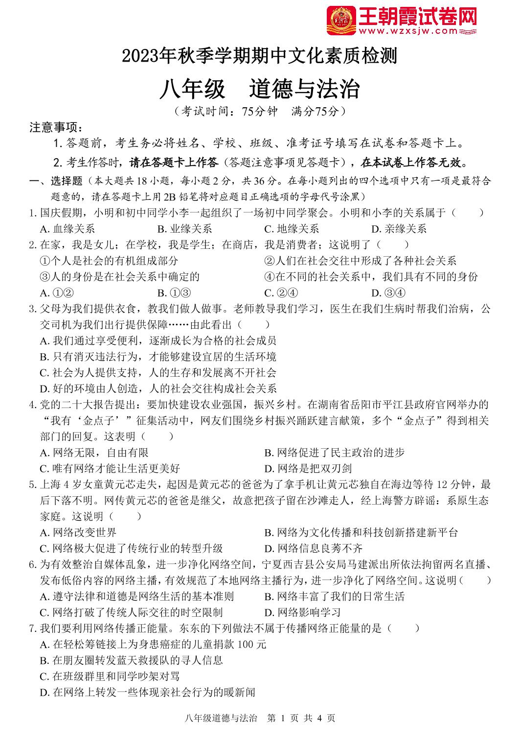 广西崇左市2023-2024学年上学期期中文化素质检测八年级道德与法治(人教版)