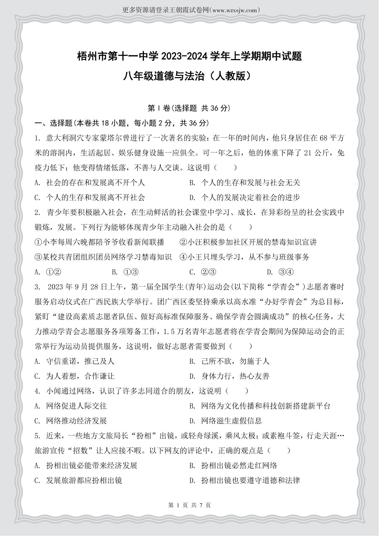 八年级道德与法治人教版上册期中卷