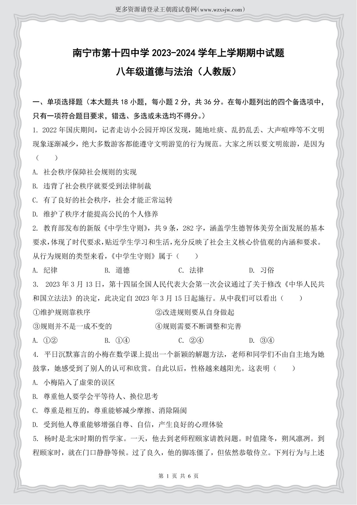 八年级道德与法治人教版上册期中卷