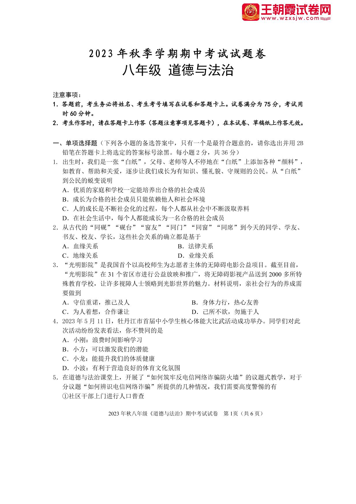 广西河池市宜州区2023-2024学年上学期期中考试试题八年级道德与法治(人教版)