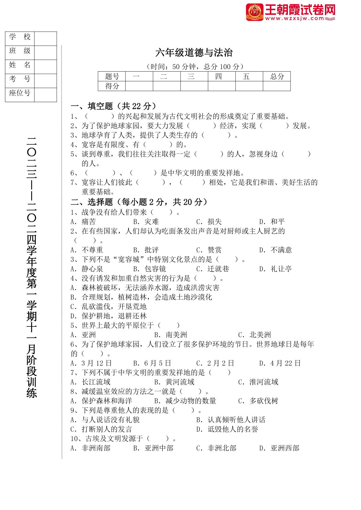 辽宁省鞍山市海城市小学联考2023-2024学年度第一学期阶段训练11月月考六年级道德与法治(人教版)
