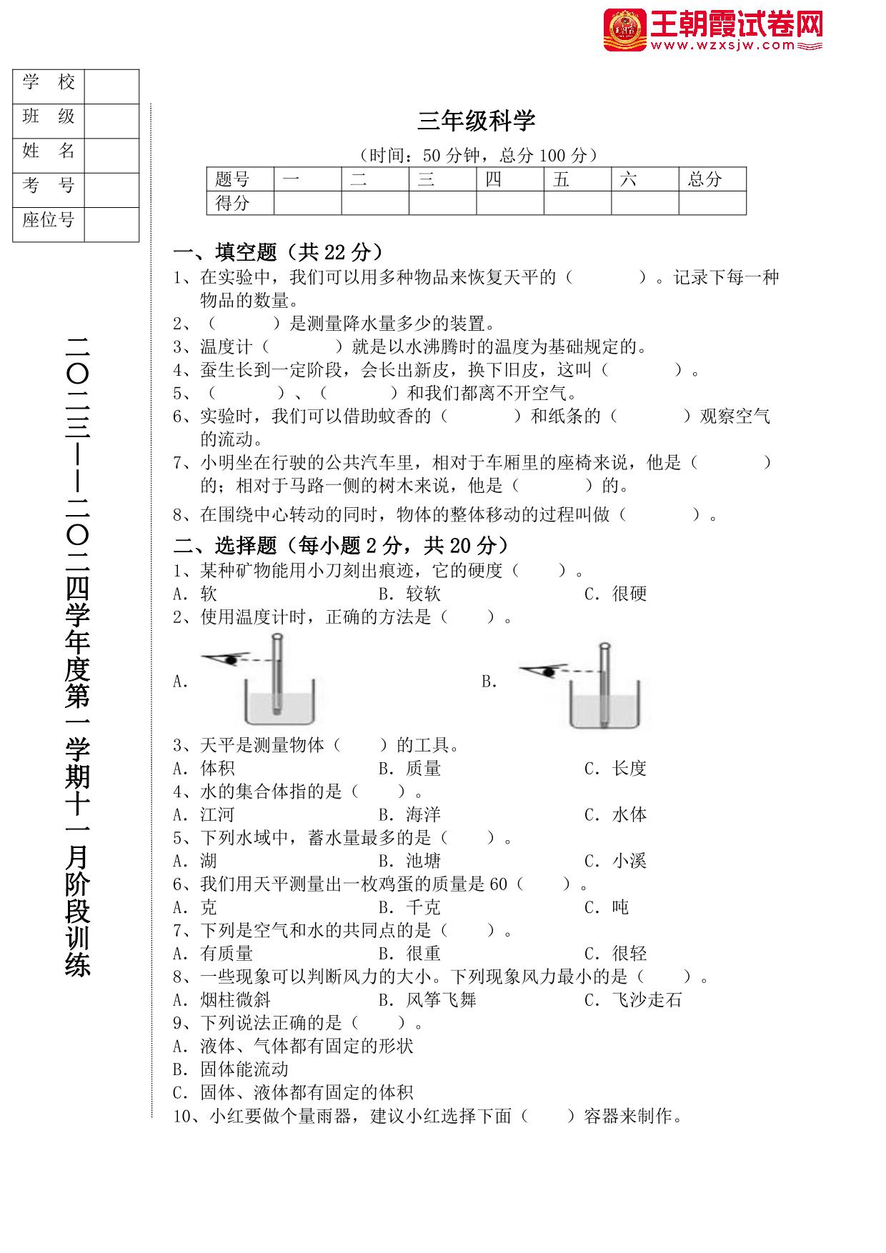 辽宁省鞍山市海城市小学联考2023-2024学年度第一学期阶段训练11月月考三年级科学(教科版)