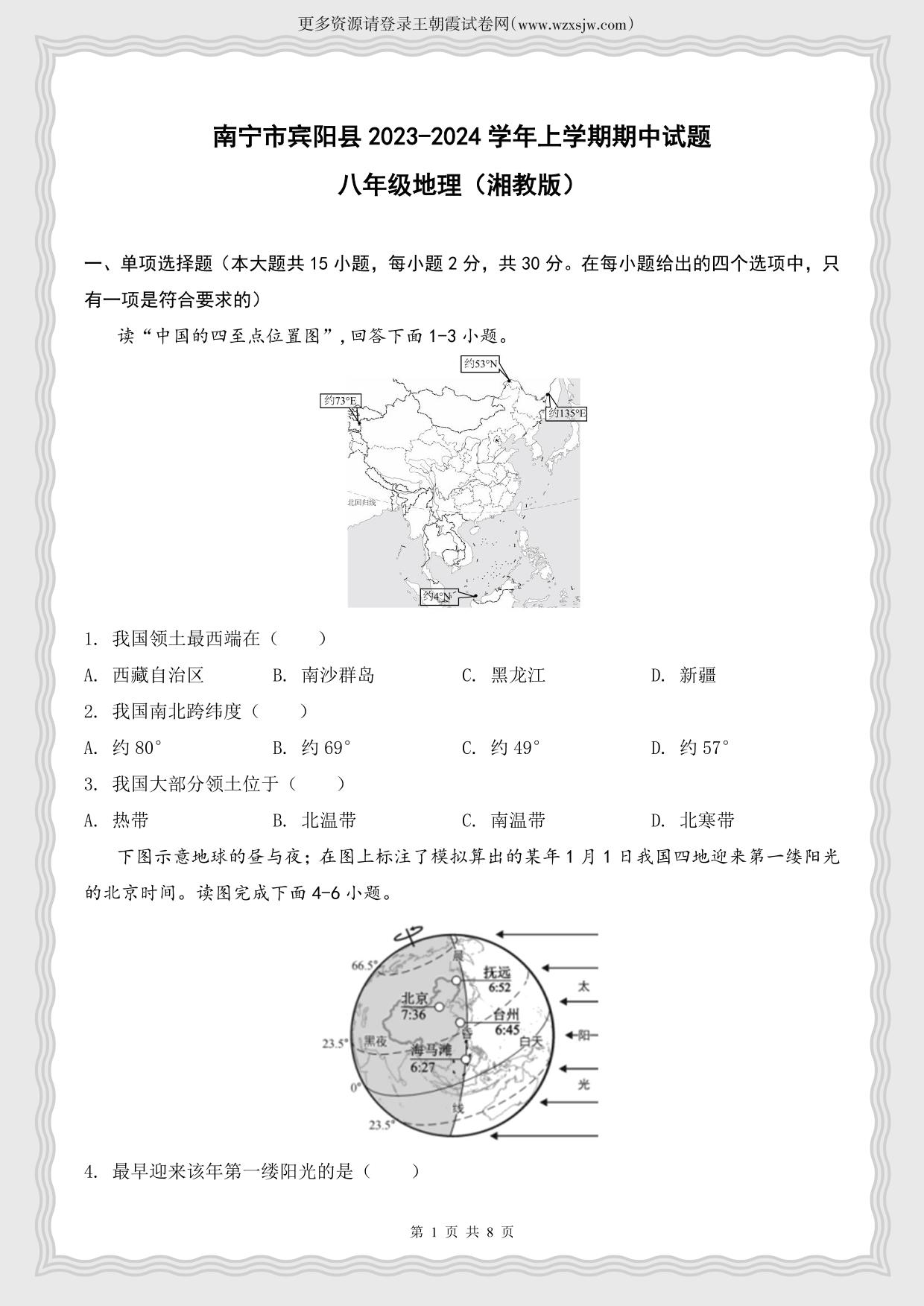 广西南宁市宾阳县2023-2024学年上学期期中试题八年级地理(湘教版)