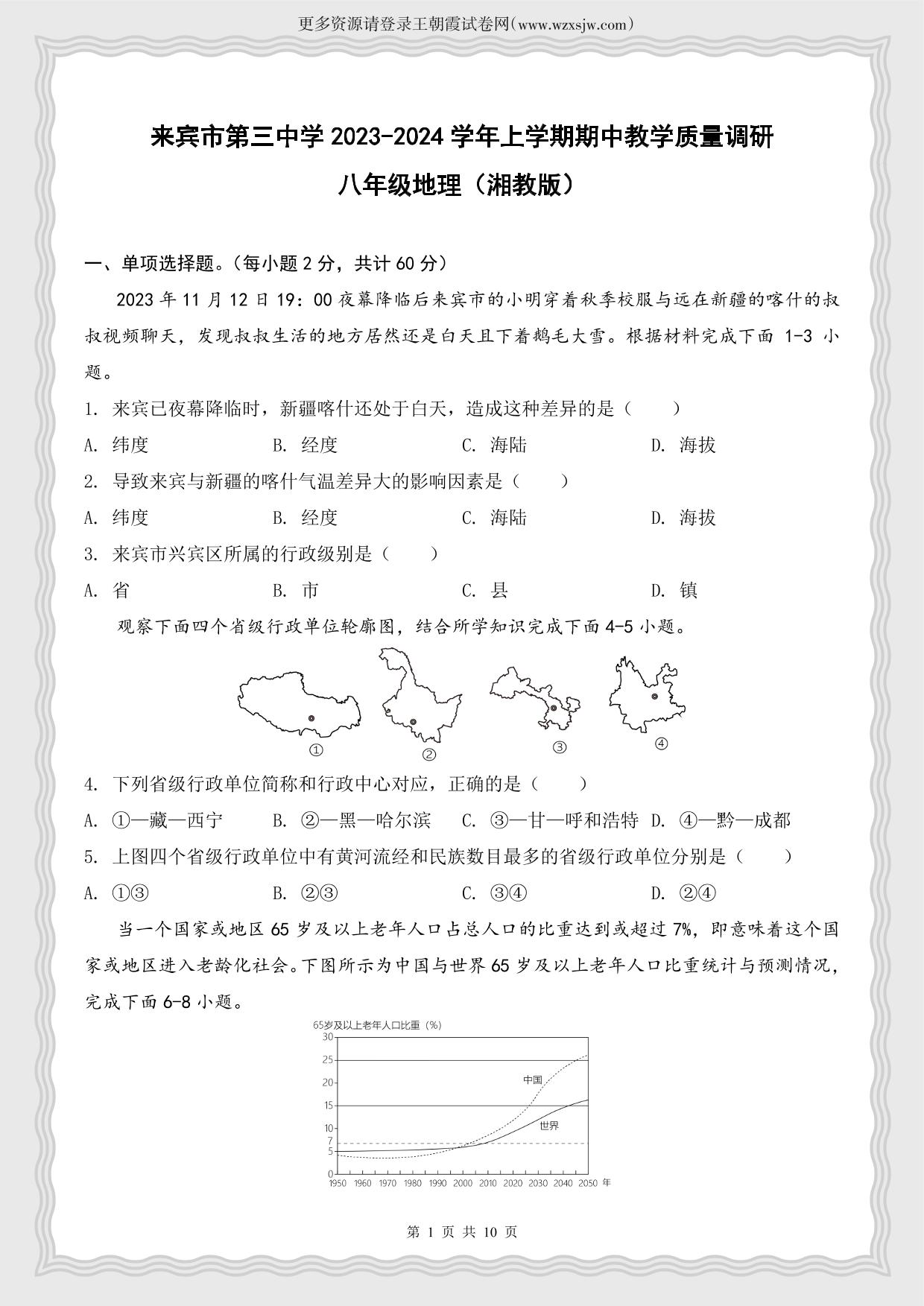 广西来宾市第三中学2023-2024学年上学期期中教学质量调研八年级地理(湘教版)