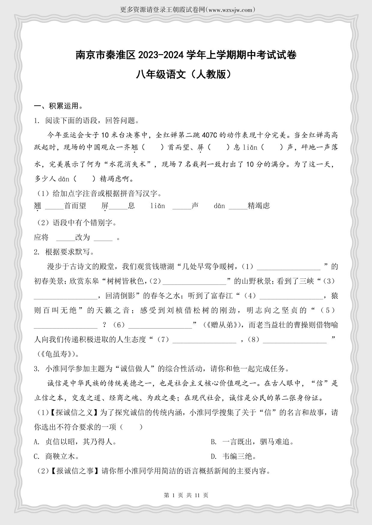 江苏省南京市秦淮区2023-2024学年上学期期中考试试卷八年级语文(人教版)