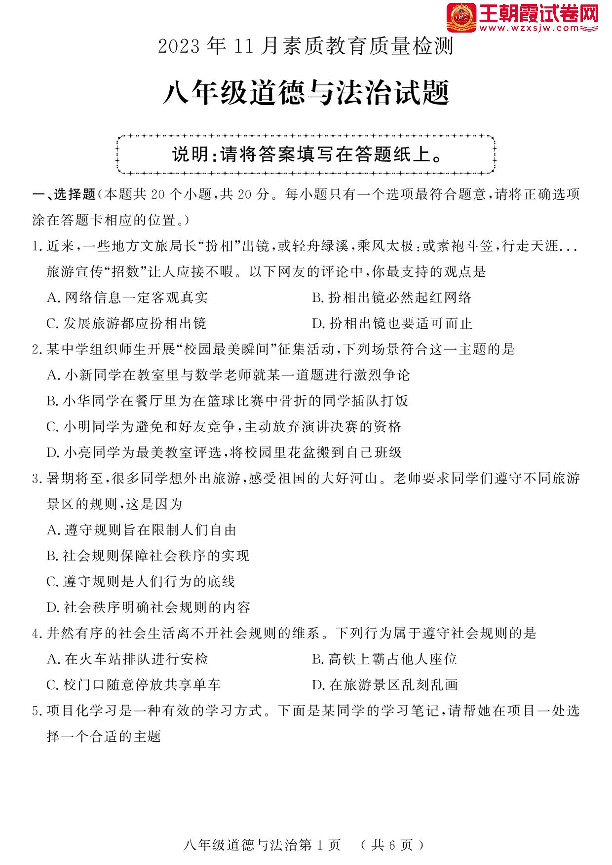 山东省菏泽市曹县2023-2024学年上学期期中素质教育质量检测八年级道德与法治(人教版)