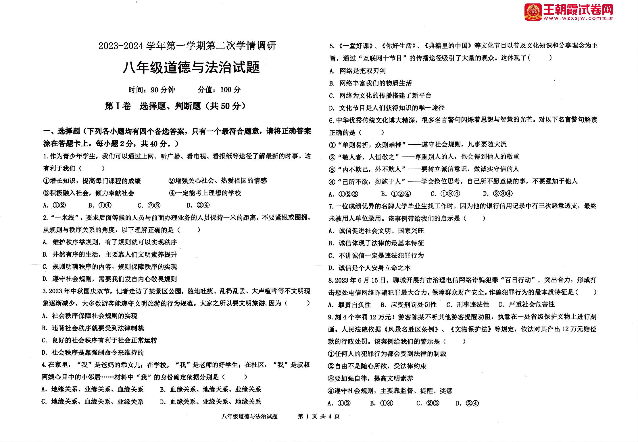 山东省聊城市运河联盟联考2023-2024学年第一学期第二次学情调研(月考)八年级道德与法治(人教版)