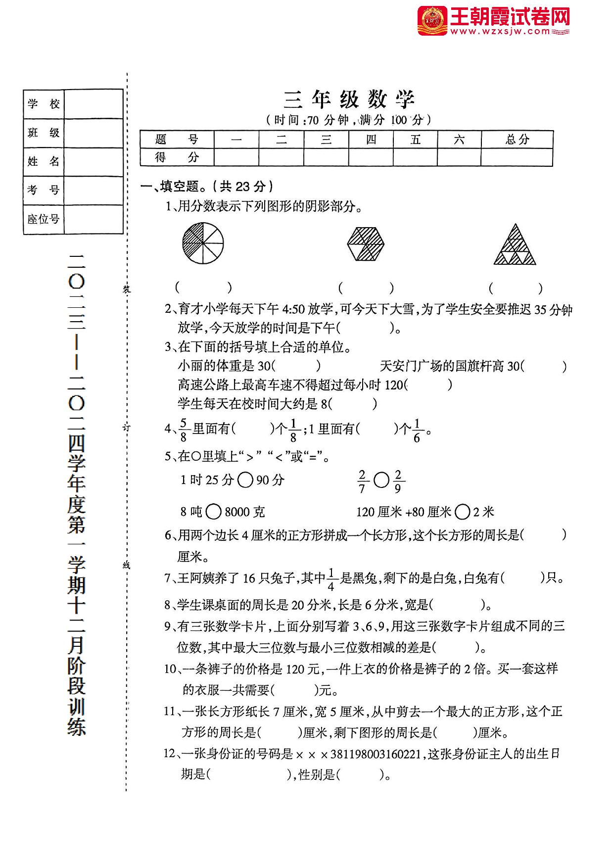 辽宁省鞍山市海城市小学联考2023-2024学年度第一学期阶段训练12月月考三年级数学(北师版)