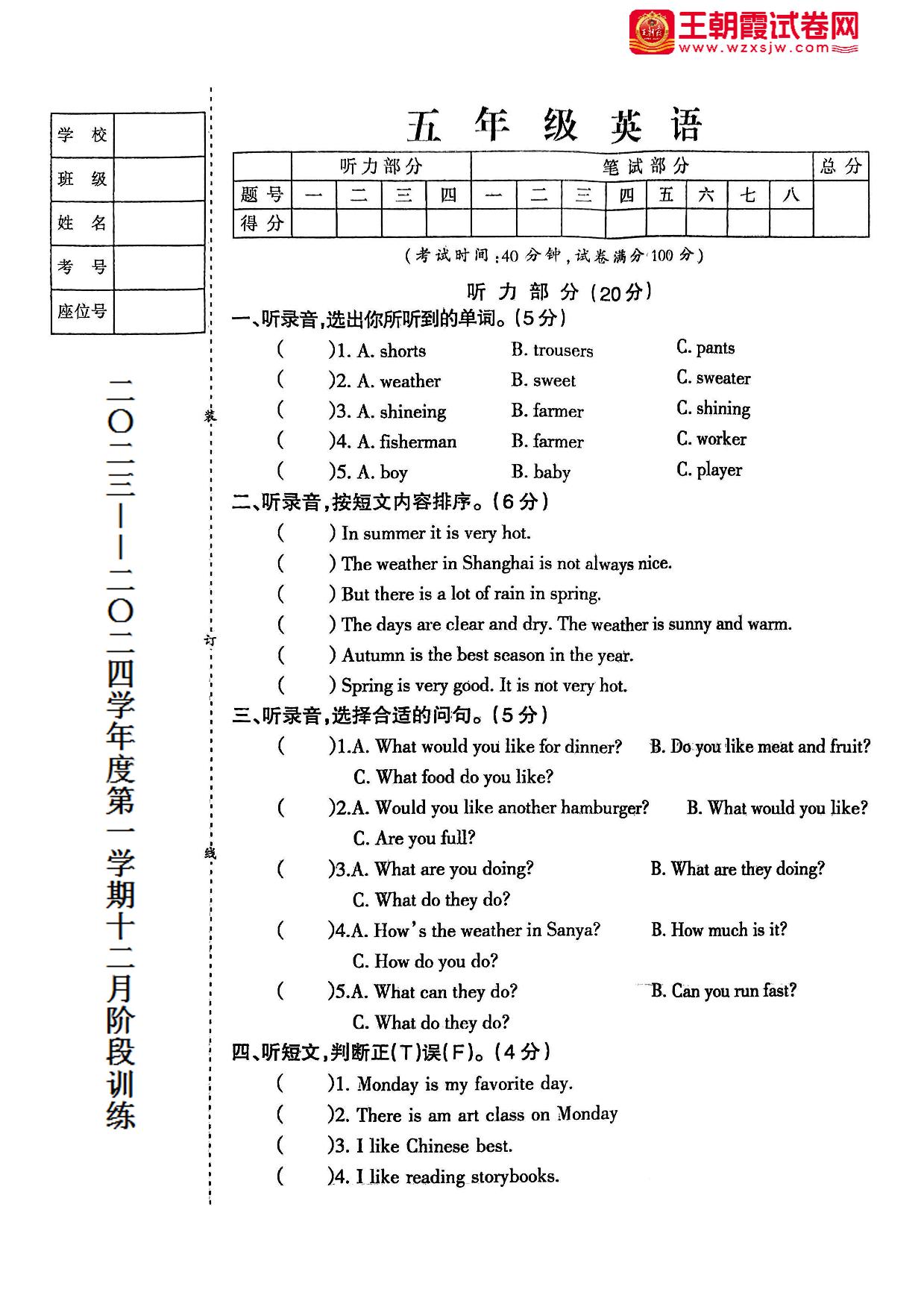 辽宁省鞍山市海城市小学联考2023-2024学年度第一学期阶段训练12月月考五年级英语(辽师大版)【无听力音频】