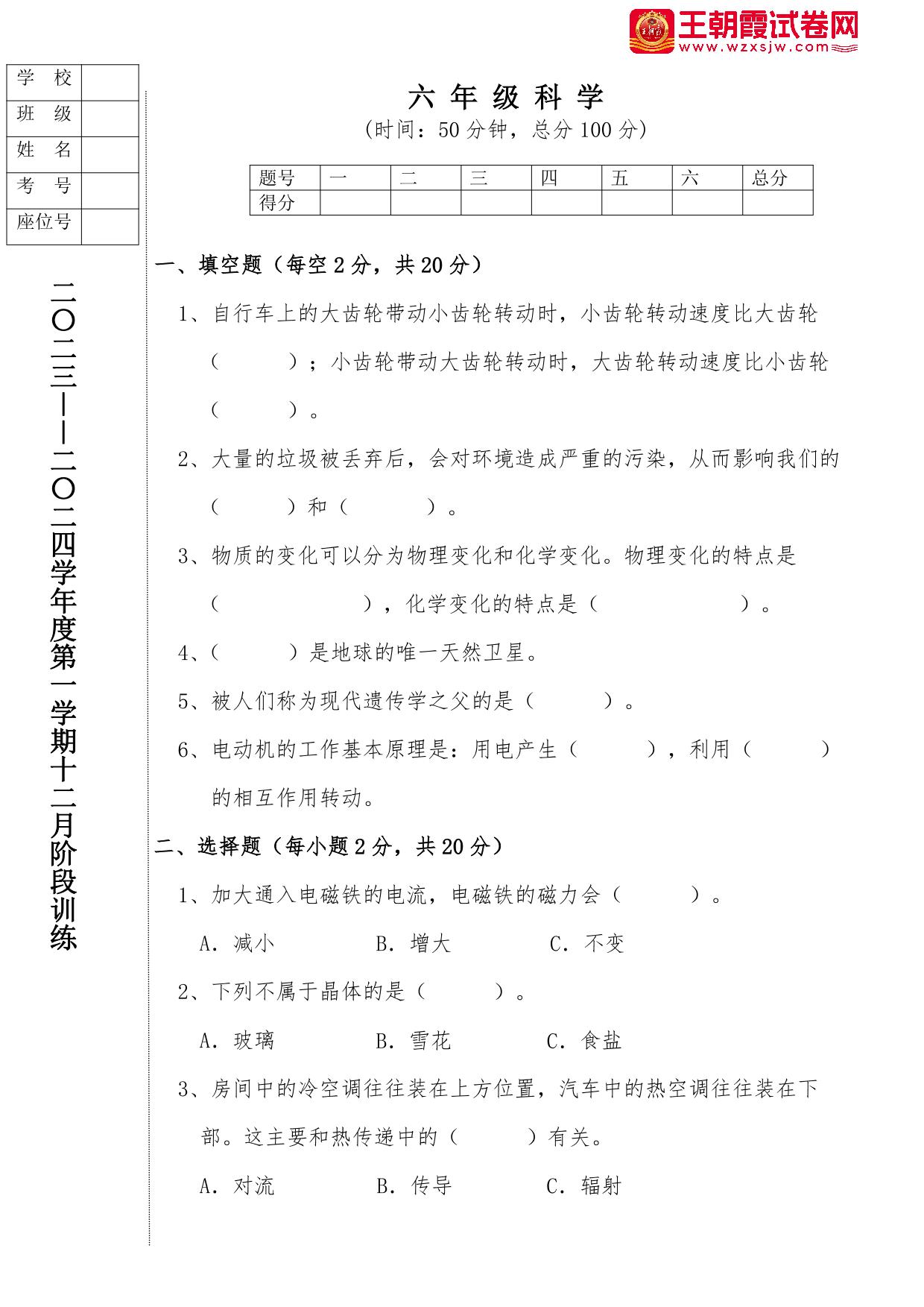 辽宁省鞍山市海城市小学联考2023-2024学年度第一学期阶段训练12月月考六年级科学(教科版)