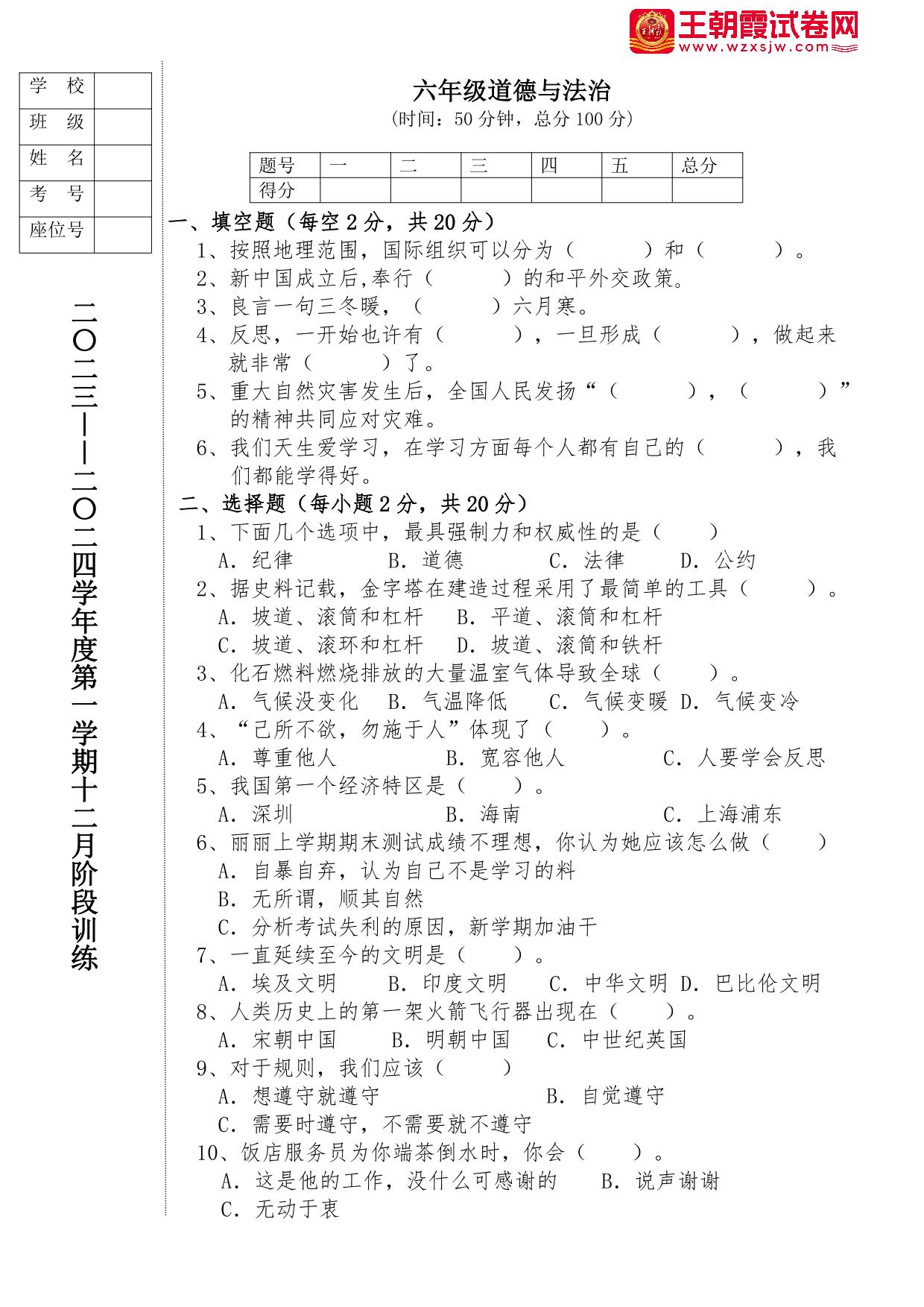 辽宁省鞍山市海城市小学联考2023-2024学年度第一学期阶段训练12月月考六年级道德与法治(人教版)