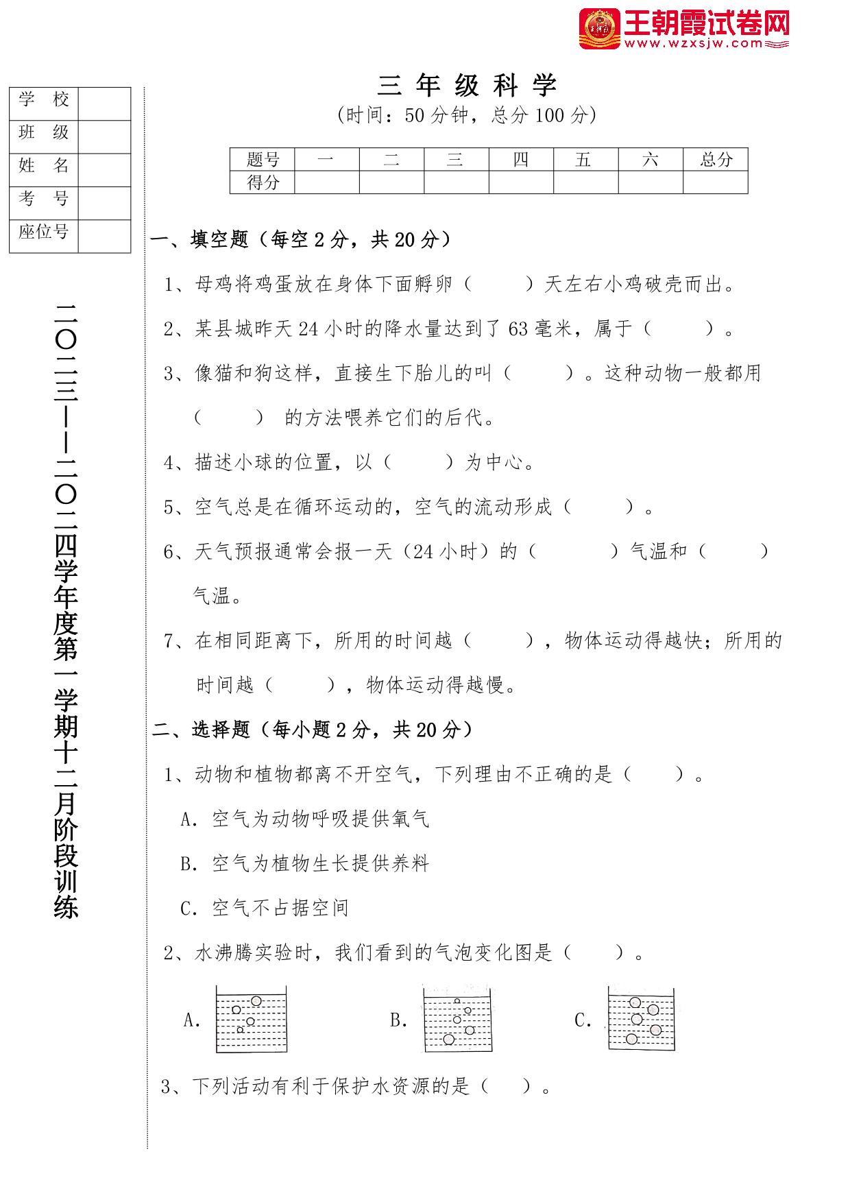 辽宁省鞍山市海城市小学联考2023-2024学年度第一学期阶段训练12月月考三年级科学(教科版)