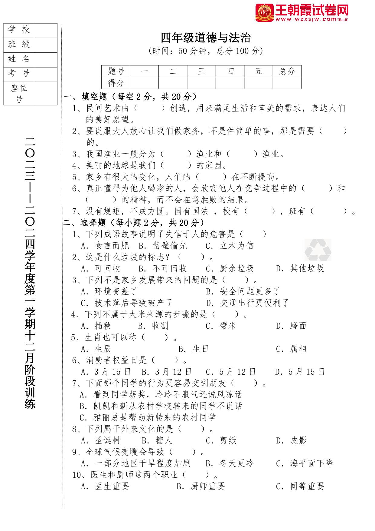 辽宁省鞍山市海城市小学联考2023-2024学年度第一学期阶段训练12月月考四年级道德与法治(人教版)