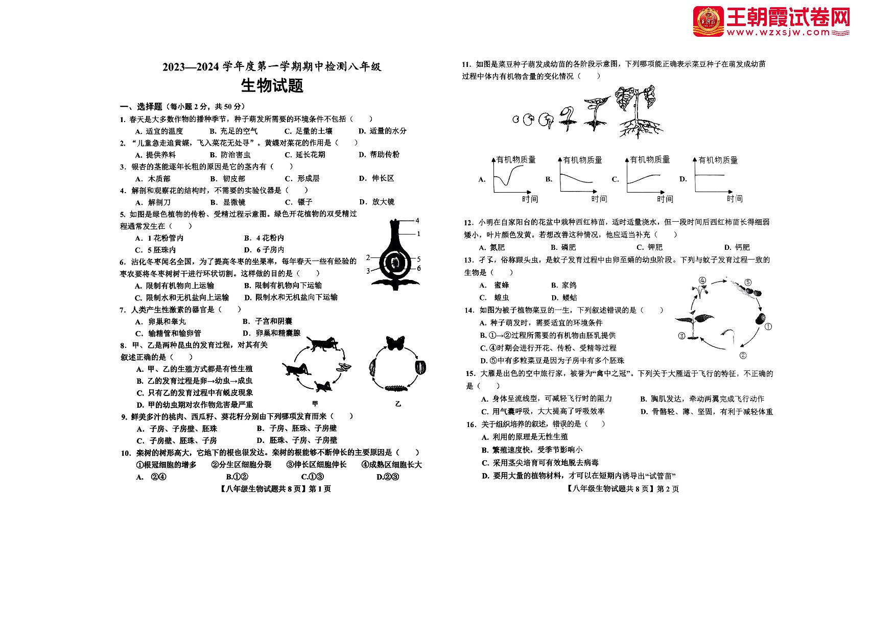 山东省德州市德城区2023-2024学年度第一学期期中检测八年级生物(人教版)