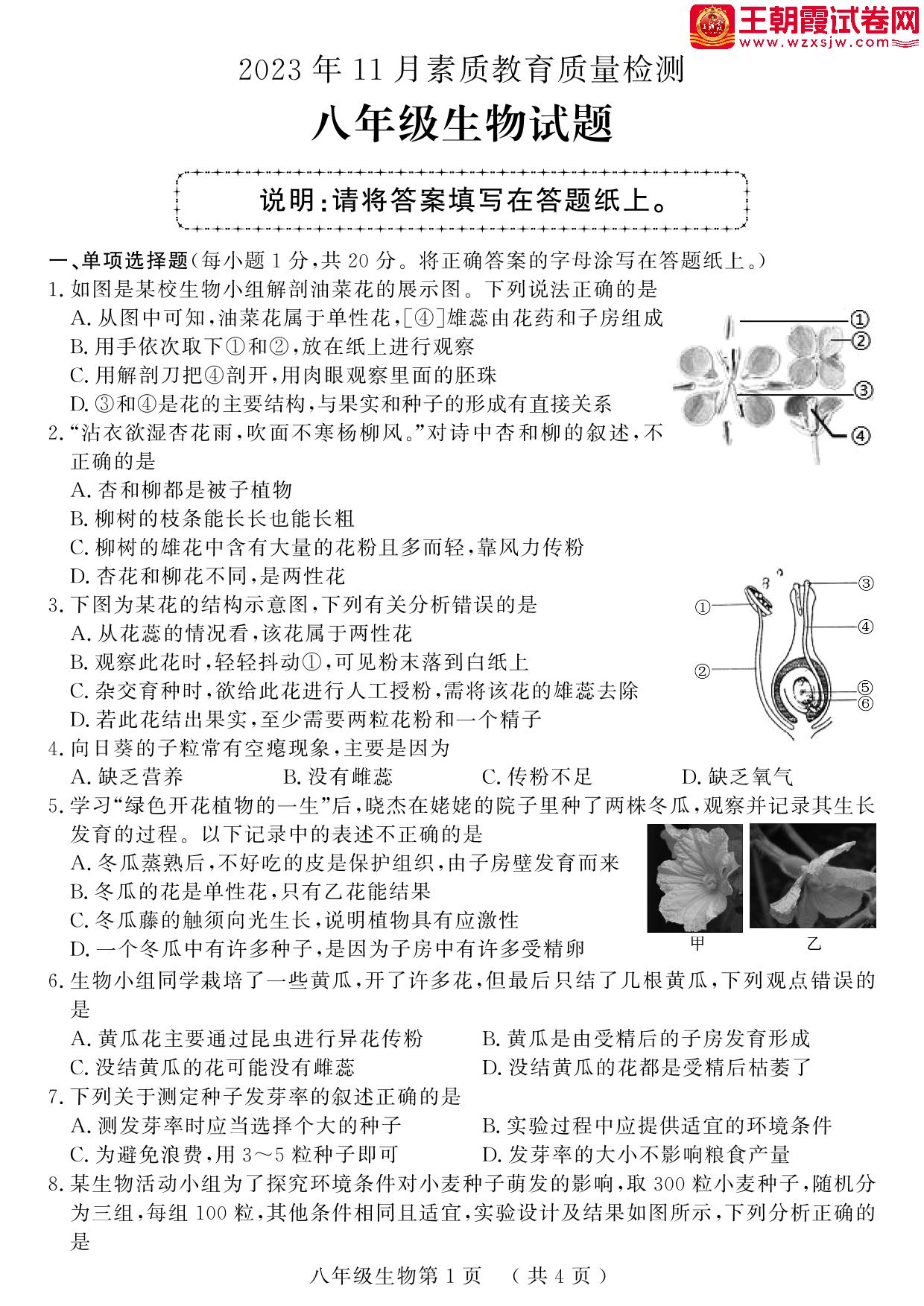山东省菏泽市曹县2023-2024学年上学期期中素质教育质量检测八年级生物(济南版)