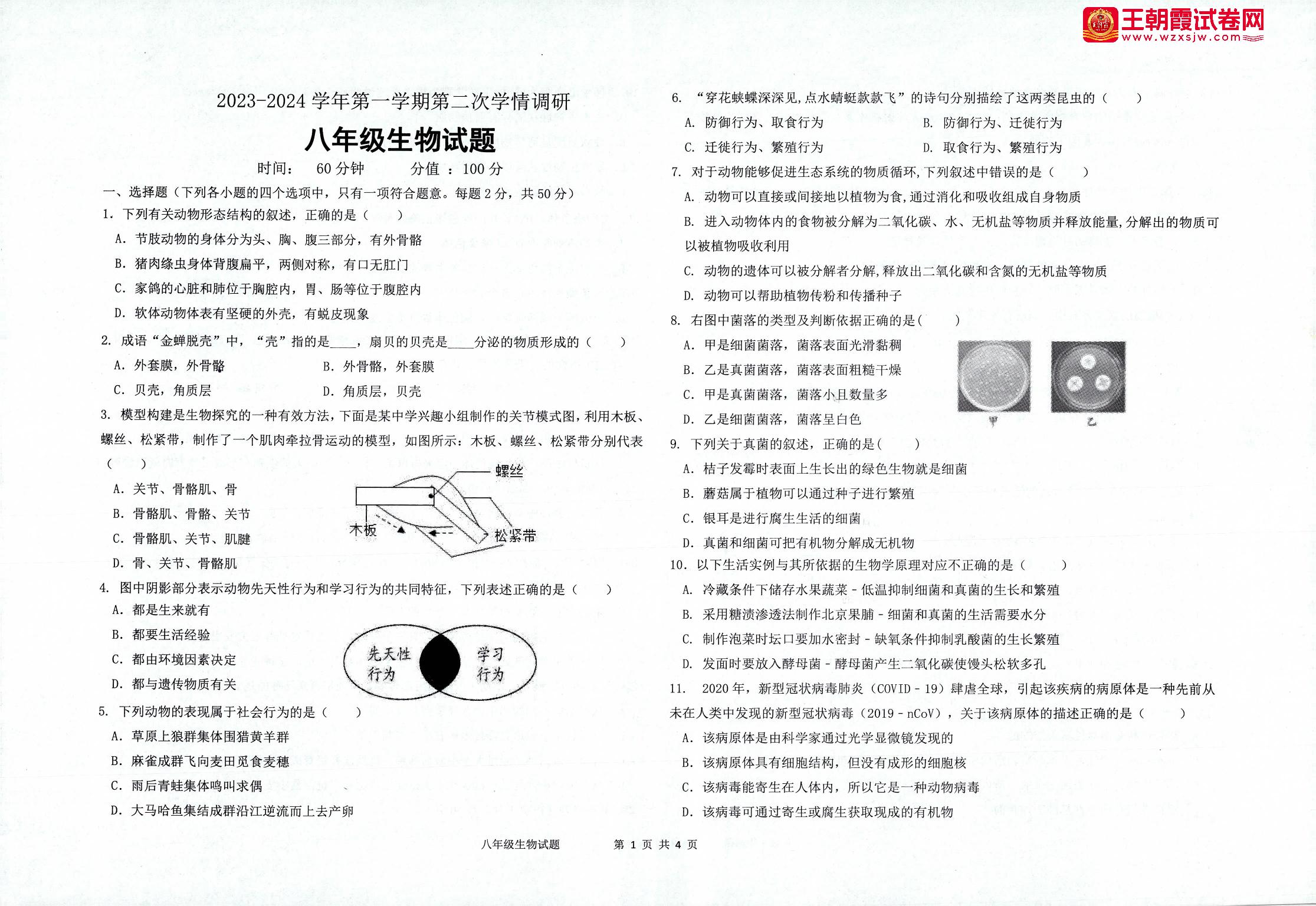 山东省聊城市运河联盟联考2023-2024学年第一学期第二次学情调研(月考)八年级生物(人教版)
