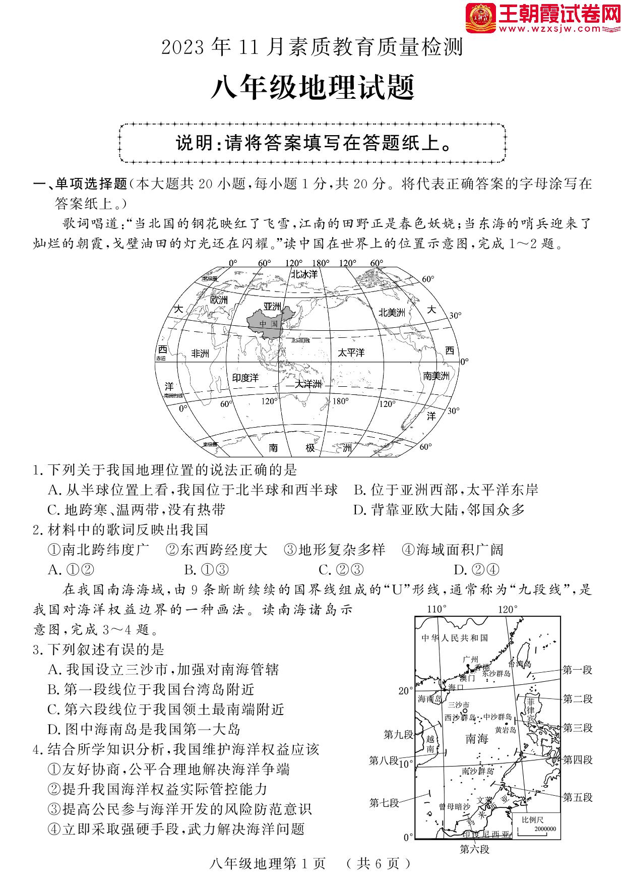 山东省菏泽市曹县2023-2024学年上学期期中素质教育质量检测八年级地理(人教版)