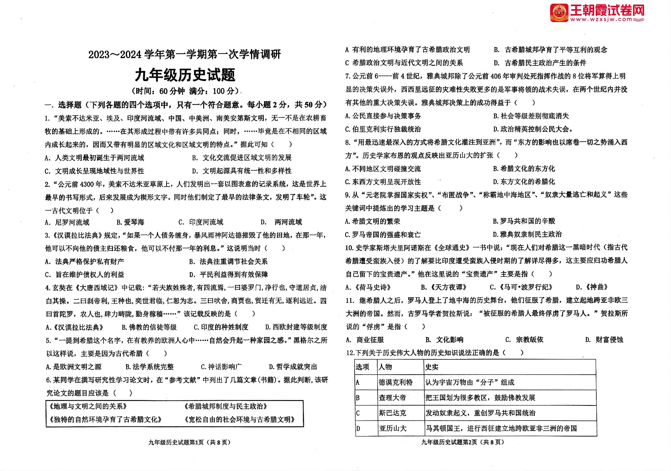 山东省聊城市运河联盟联考2023-2024学年第一学期第一次学情调研(月考)九年级历史(人教版)