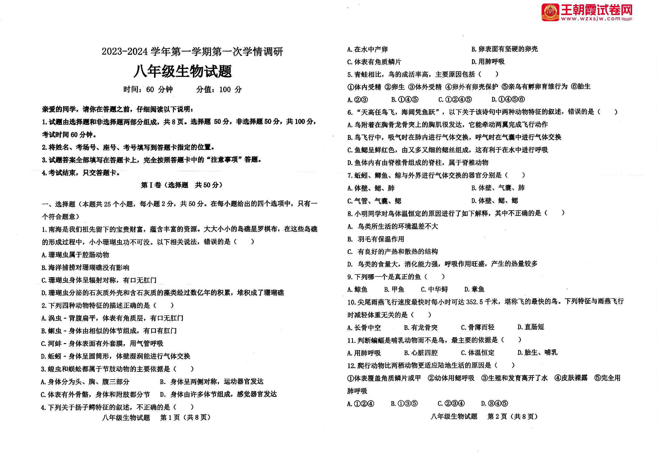山东省聊城市运河联盟联考2023-2024学年第一学期第一次学情调研(月考)八年级生物(人教版)