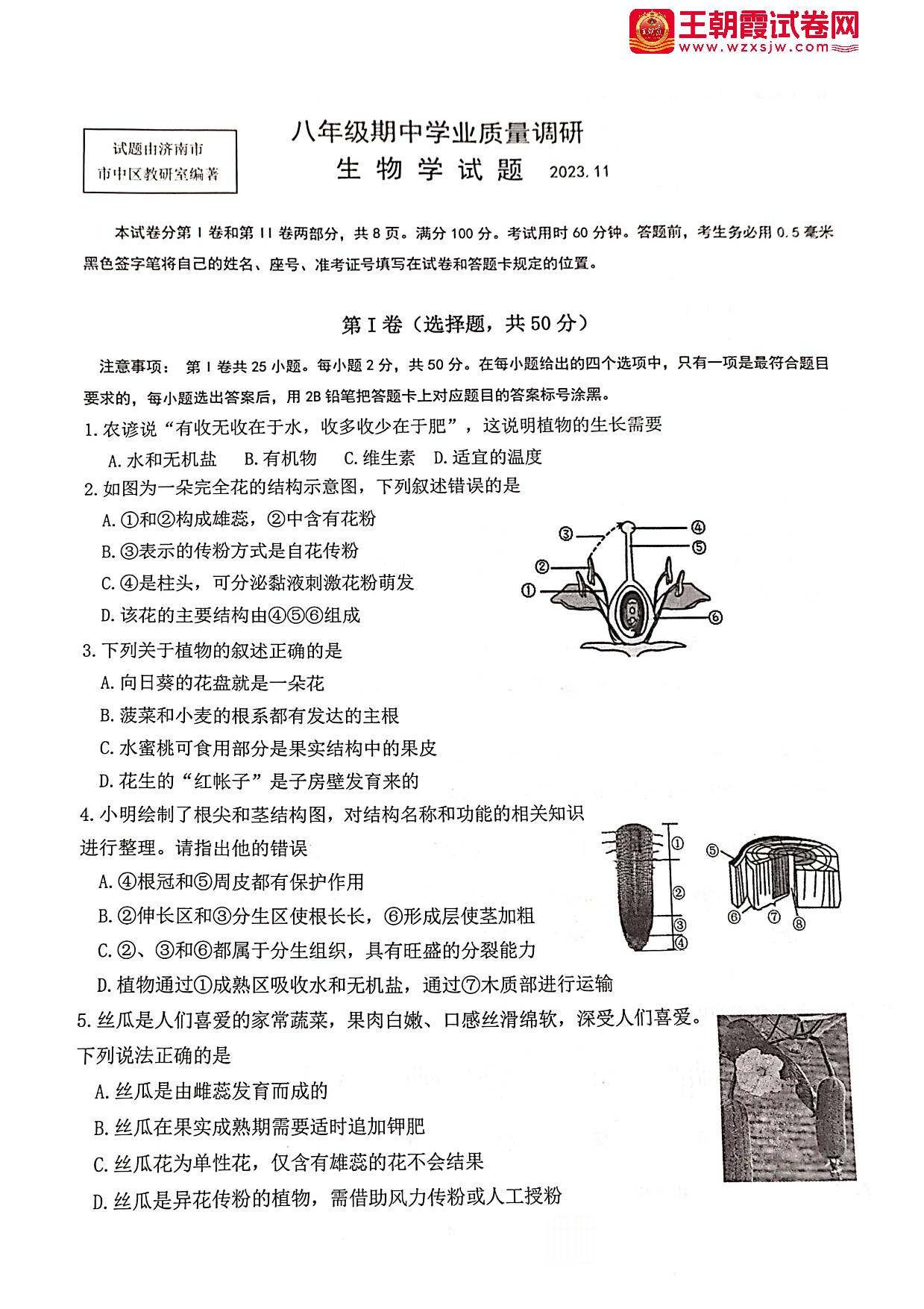 山东省济南市市中区2023-2024学年上学期期中学业质量调研八年级生物(人教版)