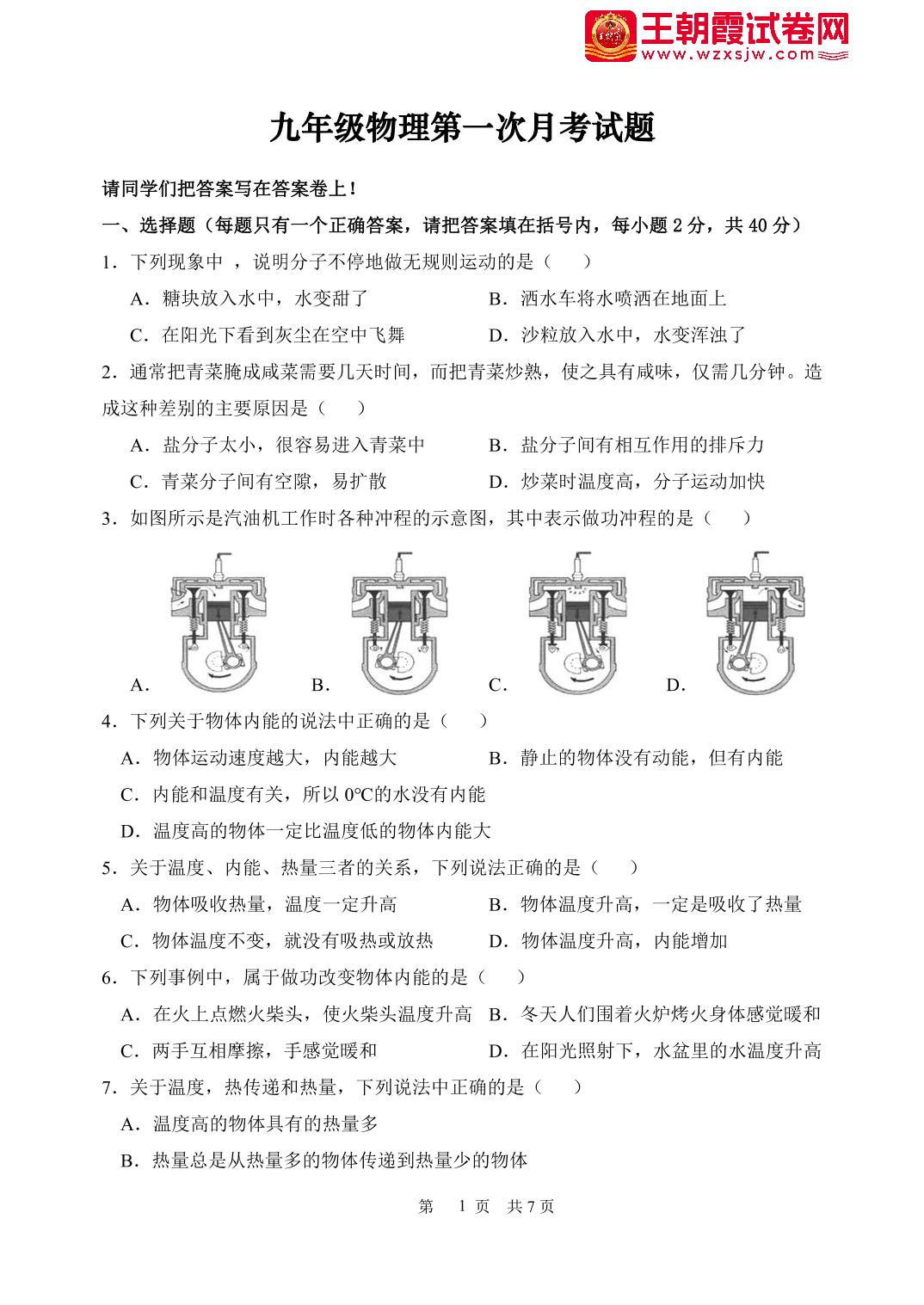 山东省菏泽市曹县博宇中学2023-2024学年上学期第一次月考试题九年级物理(人教版)