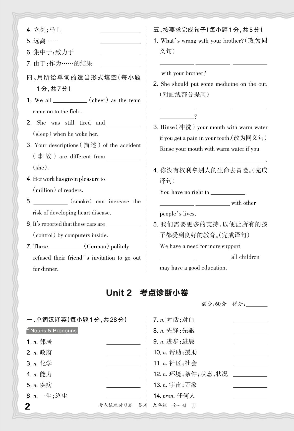 2024-2025学年九年级英语冀教版 Unit 2 考点诊断小卷