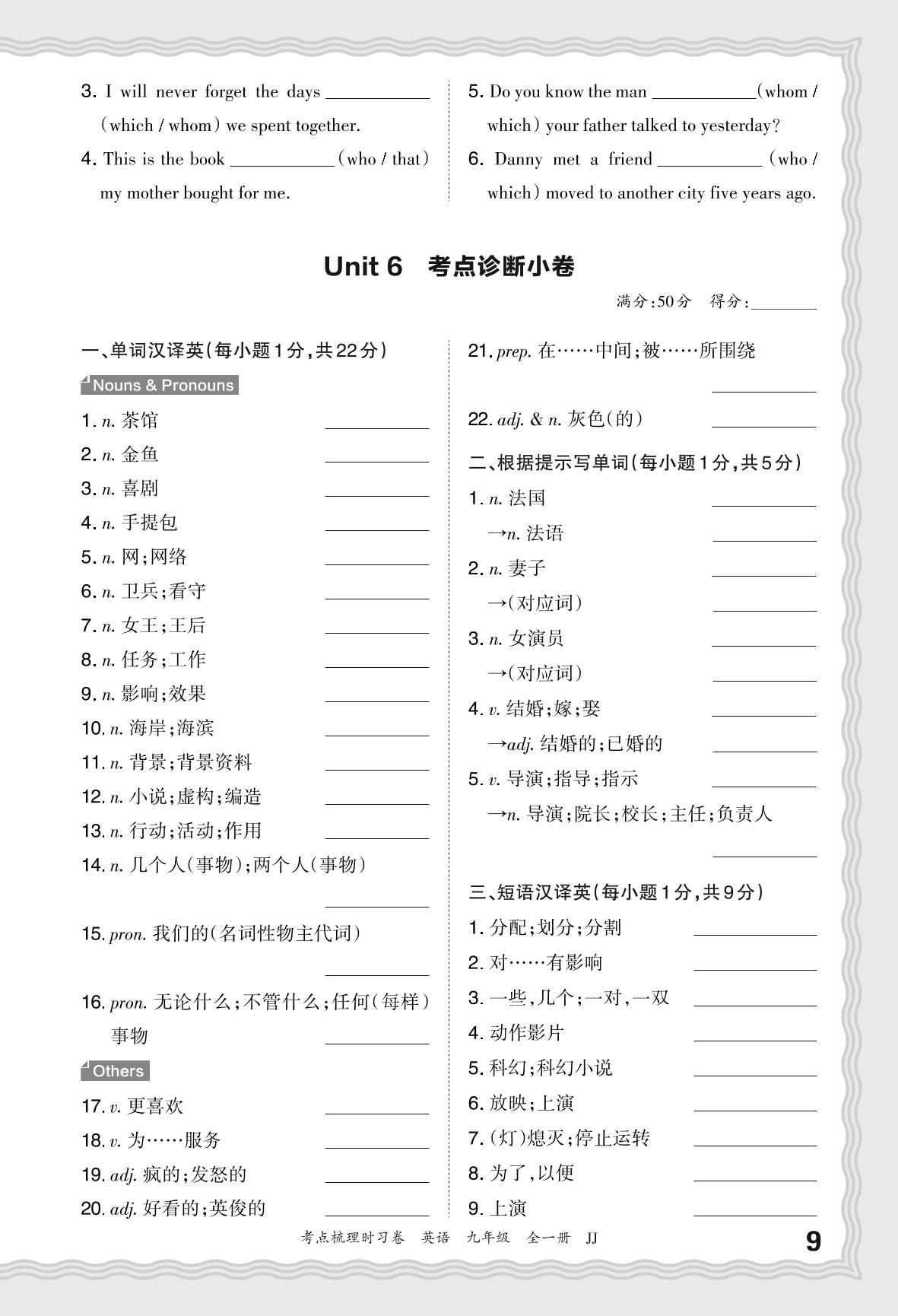 2024-2025学年九年级英语冀教版 Unit 6 考点诊断小卷