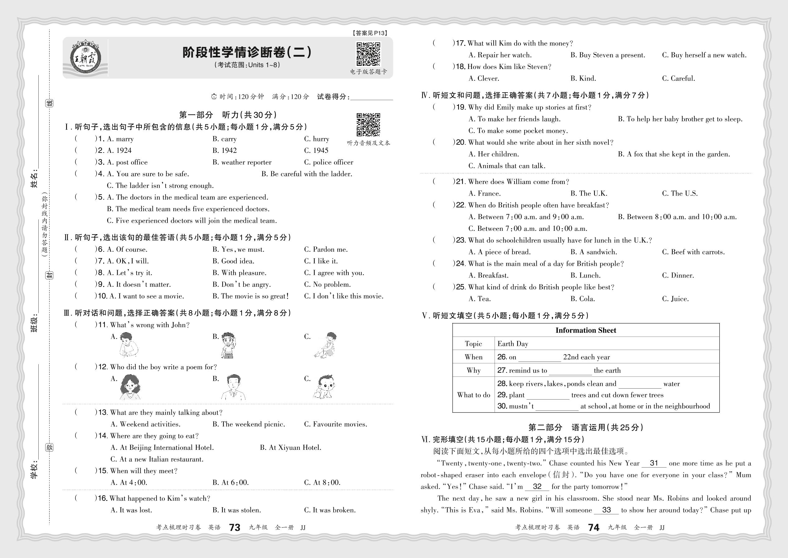 2024-2025学年九年级英语冀教版 阶段性学情诊断卷(二)