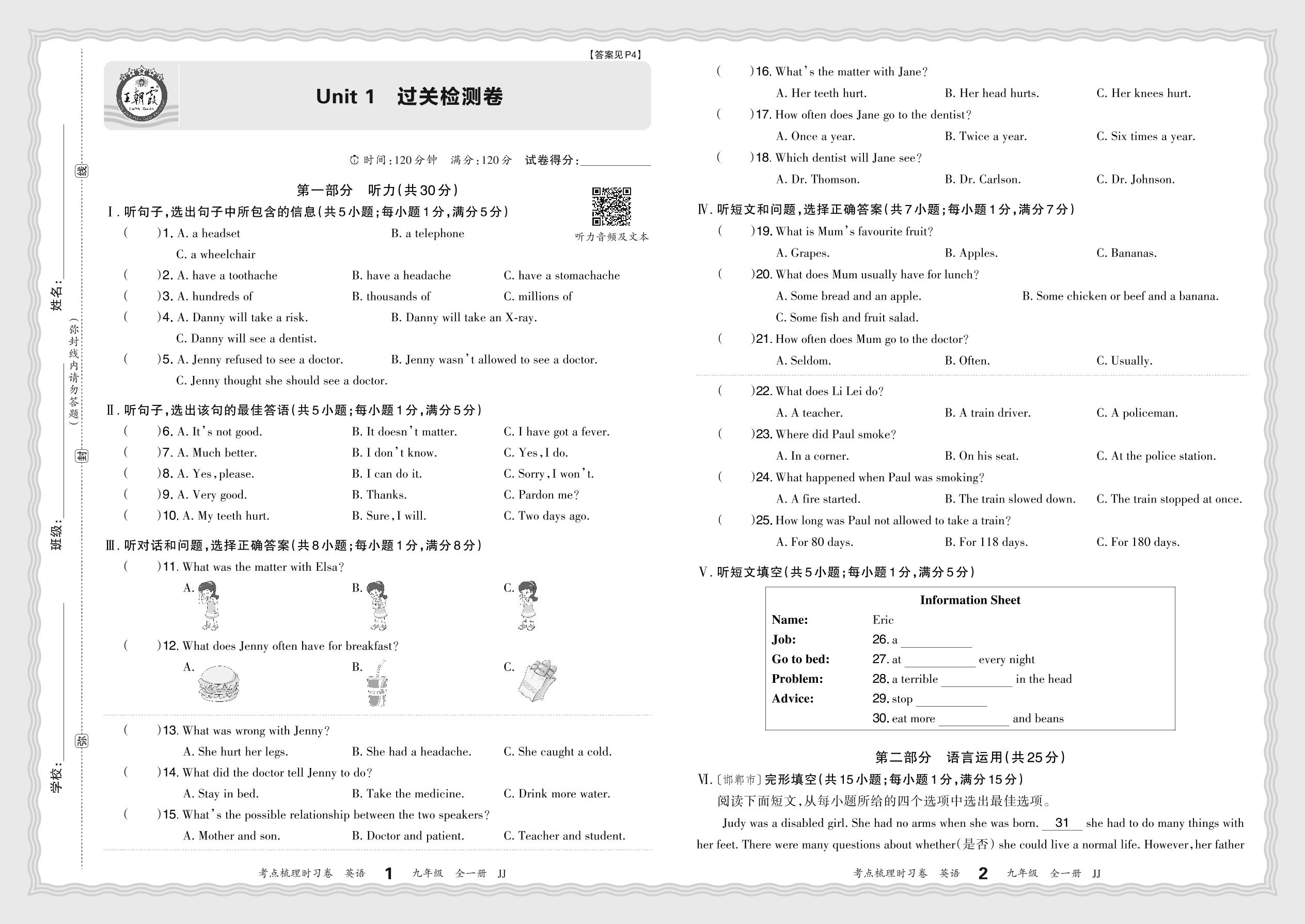 2024-2025学年九年级英语冀教版 Unit 1 过关检测卷