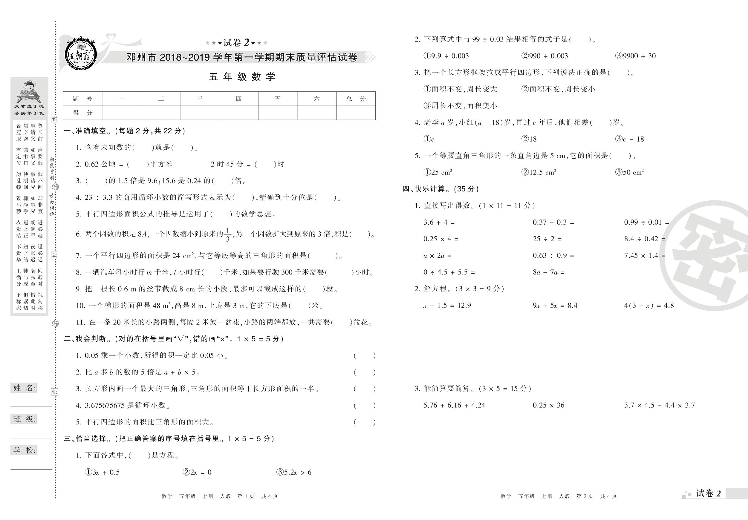 2018-2019学年第一学期邓州市五年级数学试卷(人教版)【2】