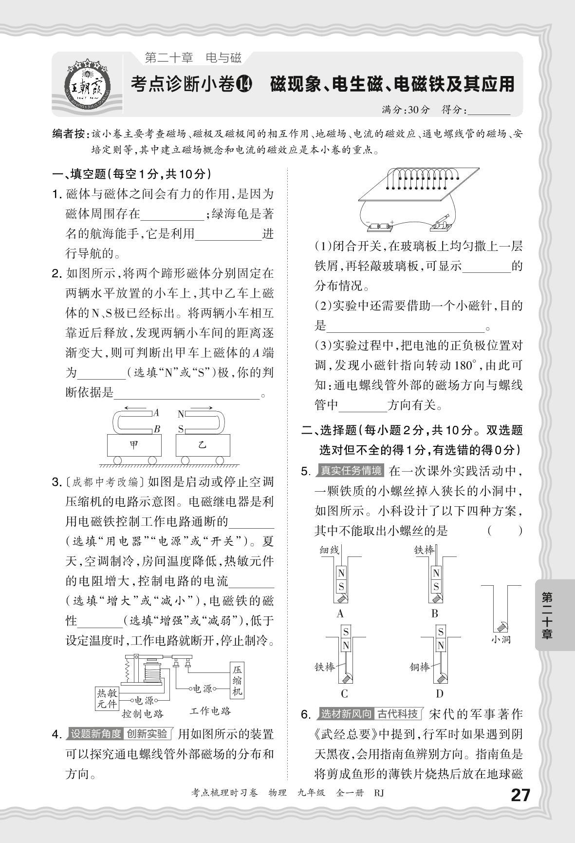 2024-2025学年九年级物理人教版 第二十章 考点诊断小卷14 磁现象、电生磁、电磁铁及其应用