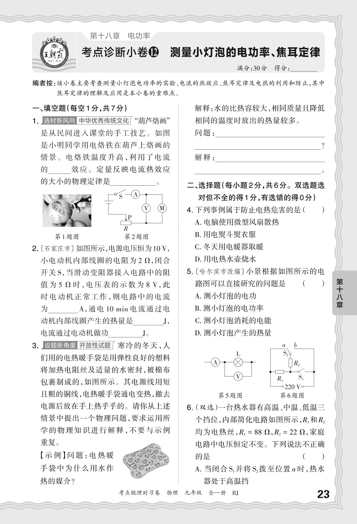 2024-2025学年九年级物理人教版 第十八章 考点诊断小卷12 测量小灯泡的电功率、焦耳定律