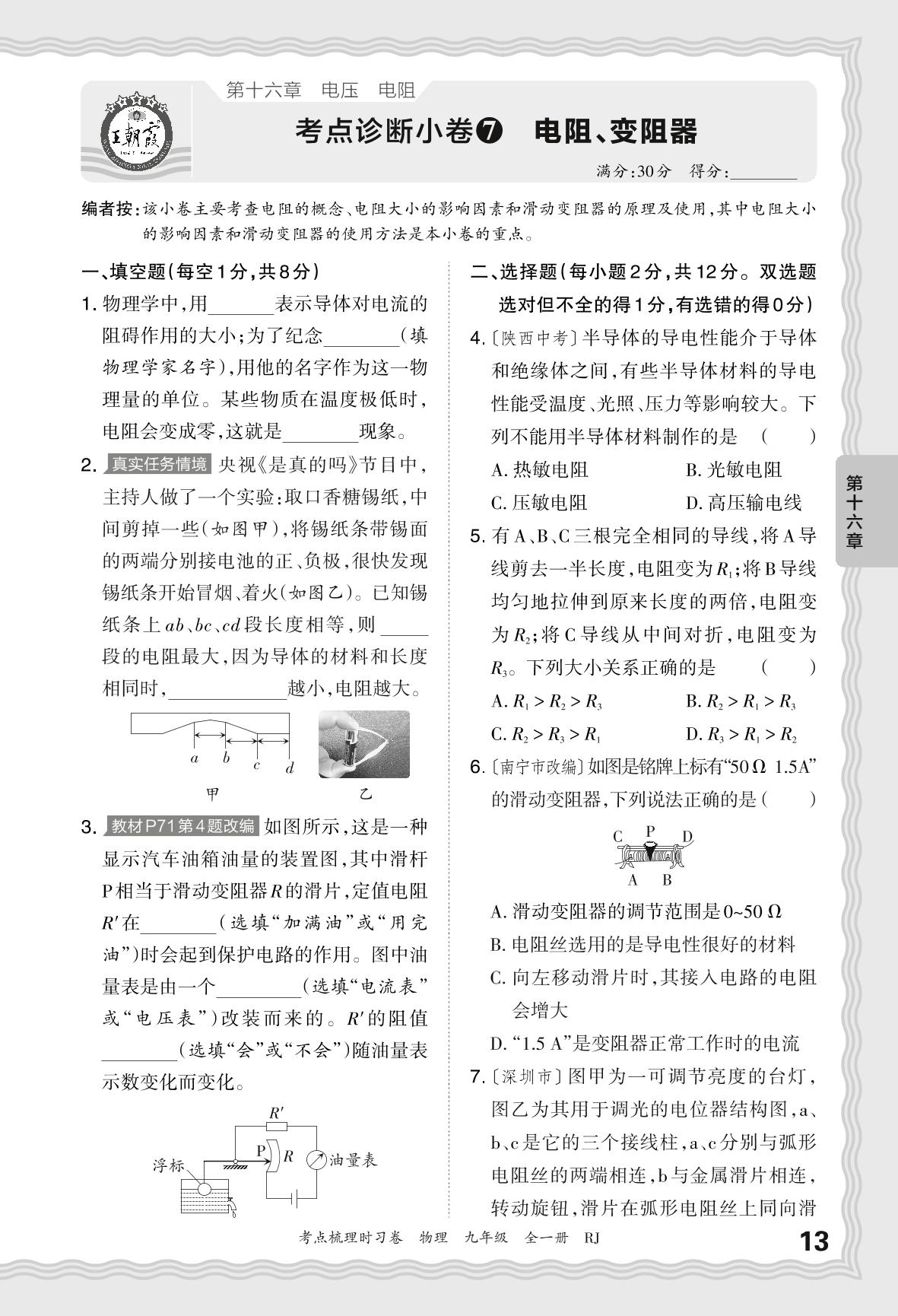 2024-2025学年九年级物理人教版 第十六章 考点诊断小卷7 电阻、变阻器