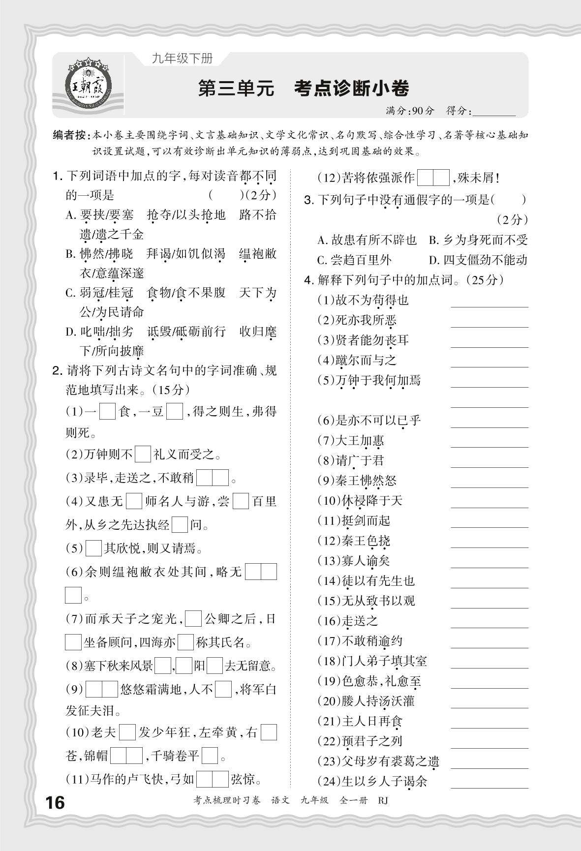 2025下册九年级语文人教版 第三单元 考点诊断小卷