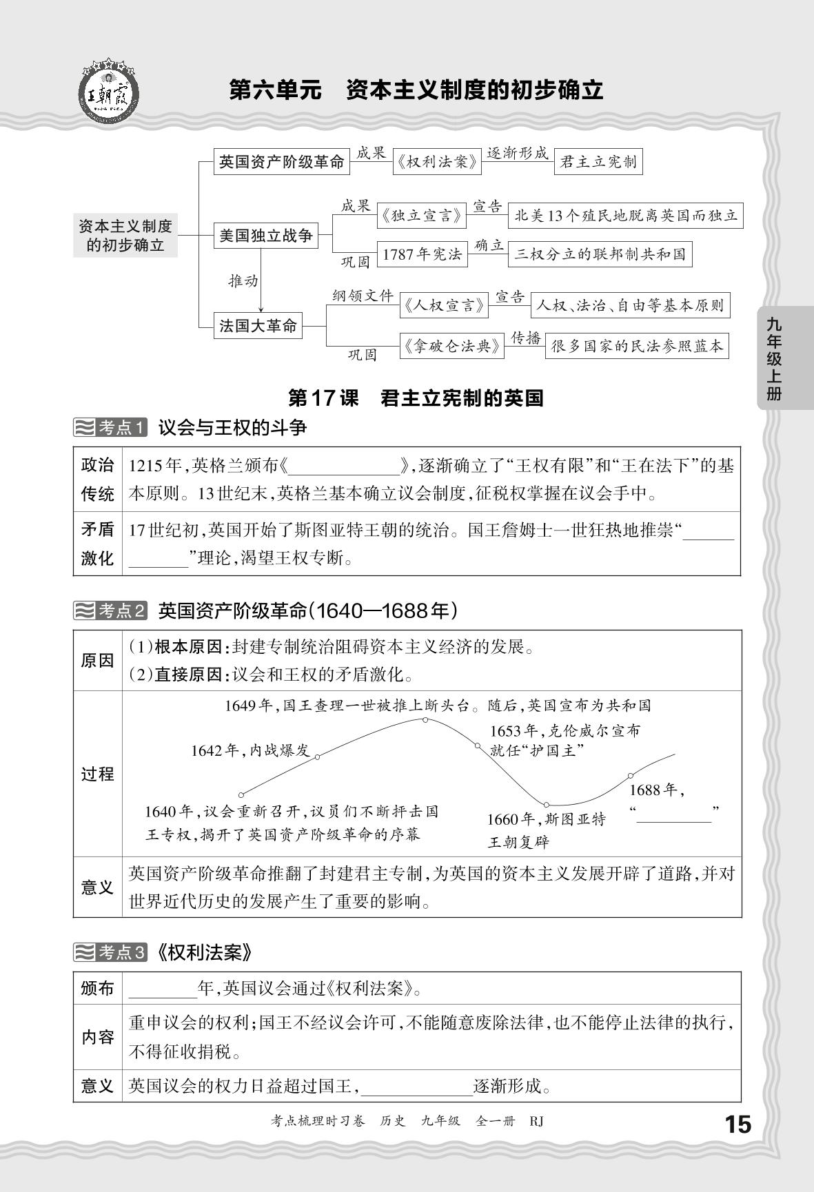 2024上册九年级历史人教版 考点梳理手册——第六单元 资本主义制度的初步确立