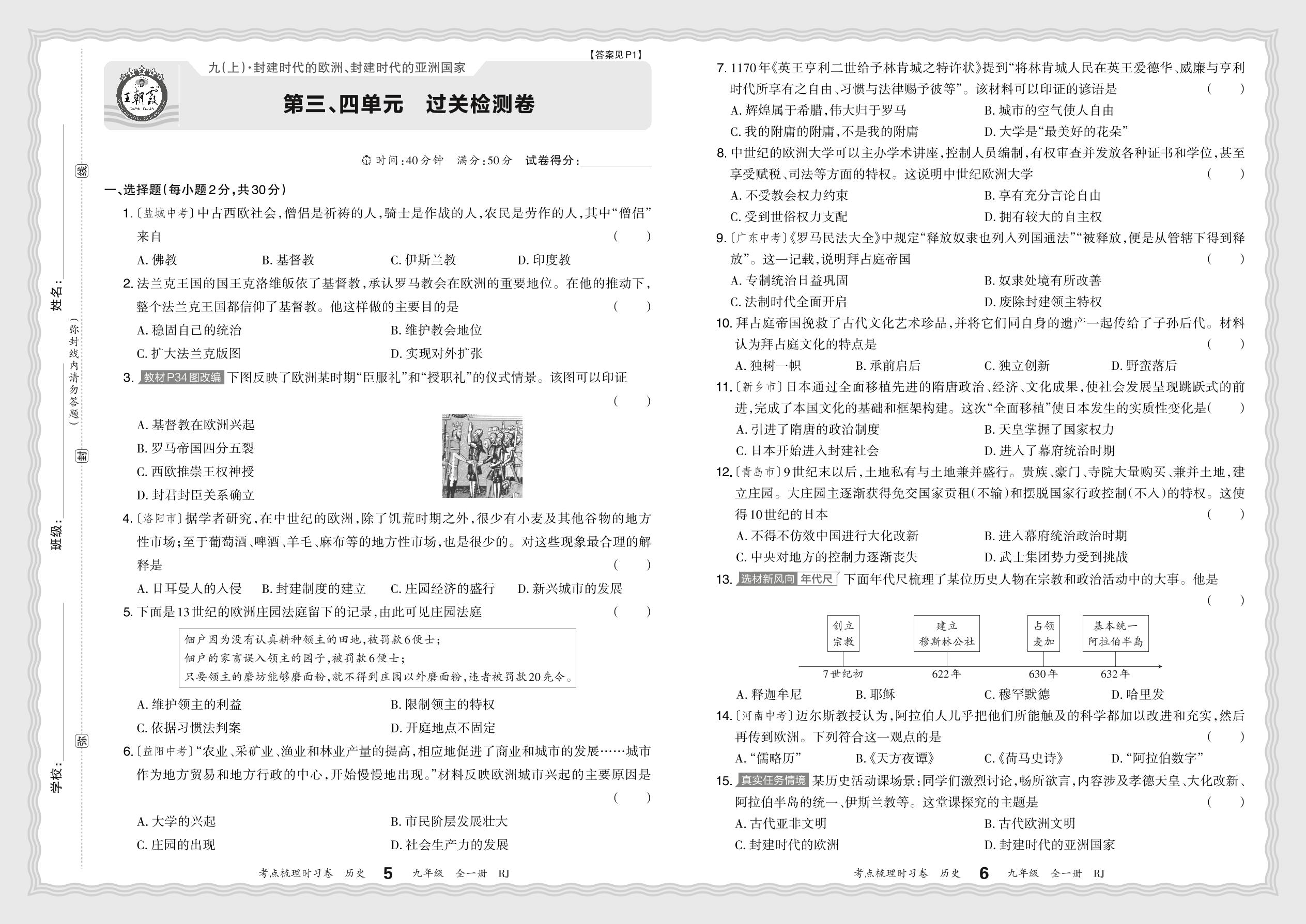2024上册九年级历史人教版 第三、四单元 过关检测卷