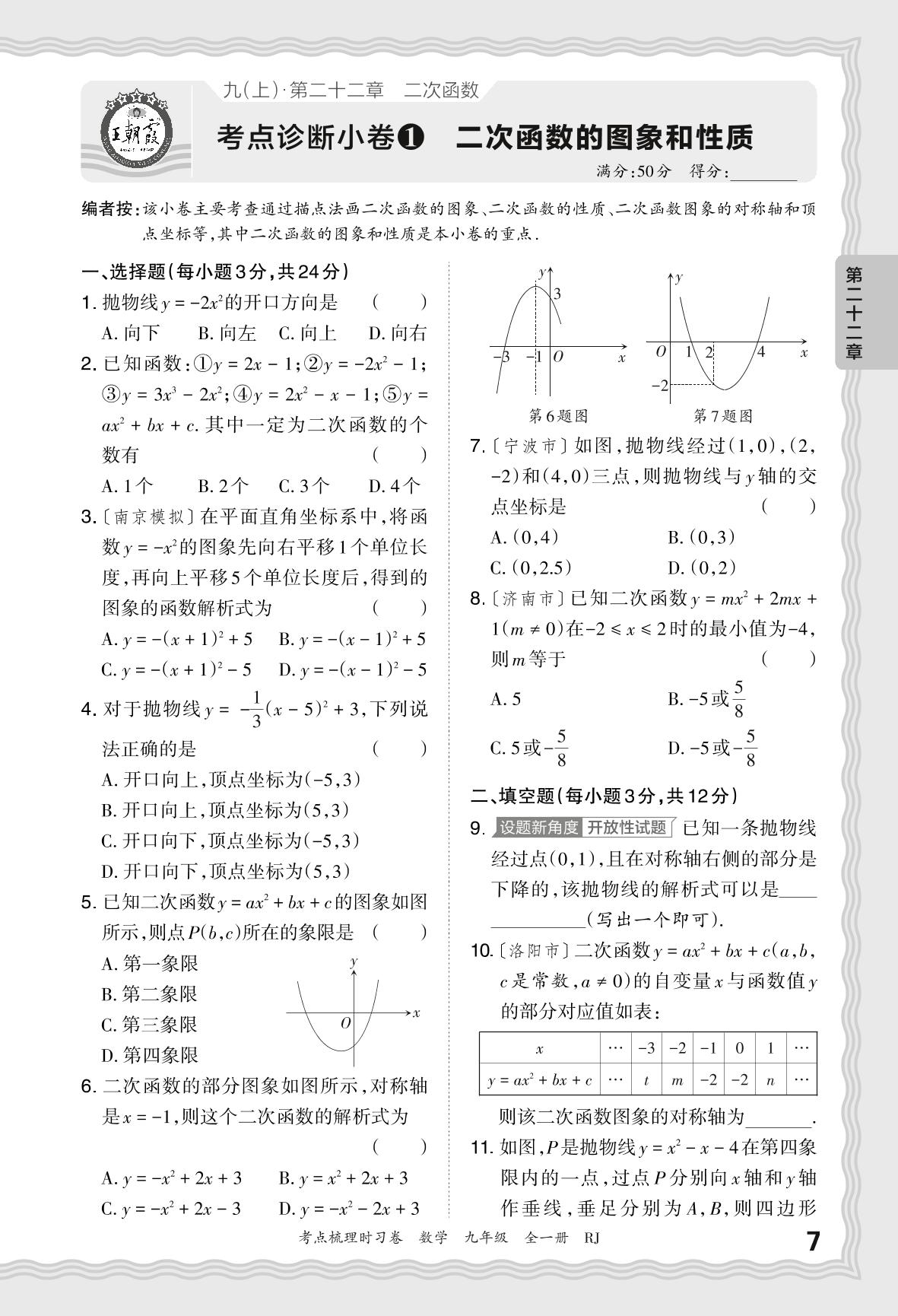 2024上册九年级数学人教版 第二十二章 考点诊断小卷1 二次函数的图象和性质