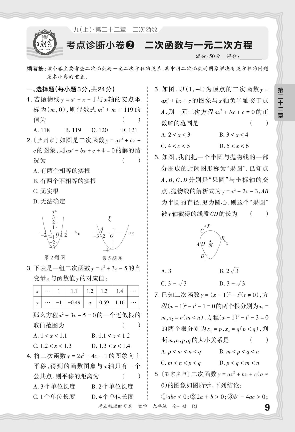 2024上册九年级数学人教版 第二十二章 考点诊断小卷2 二次函数与一元二次方程