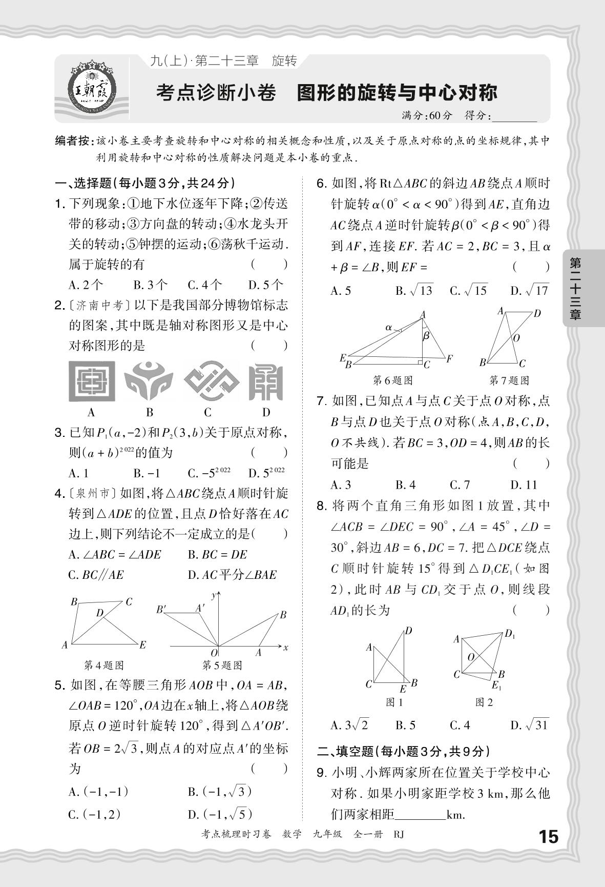 2024上册九年级数学人教版 第二十三章 考点诊断小卷 图形的旋转与中心对称