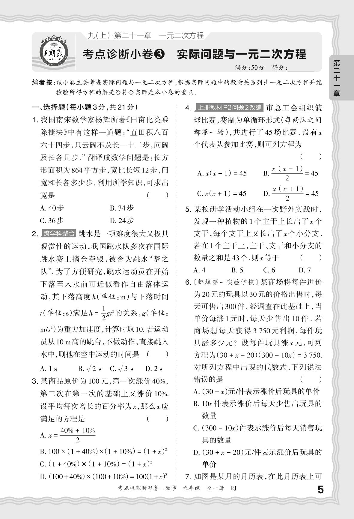 2024上册九年级数学人教版 第二十一章 考点诊断小卷3 实际问题与一元二次方程
