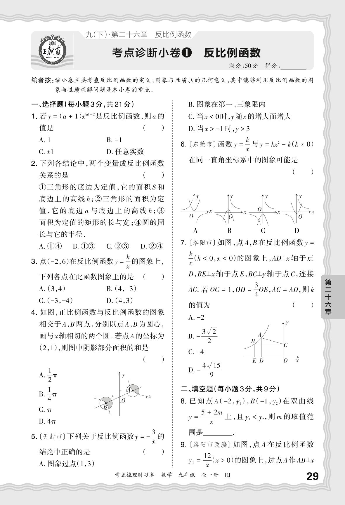 2025下册九年级数学人教版 第二十六章 考点诊断小卷1 反比例函数