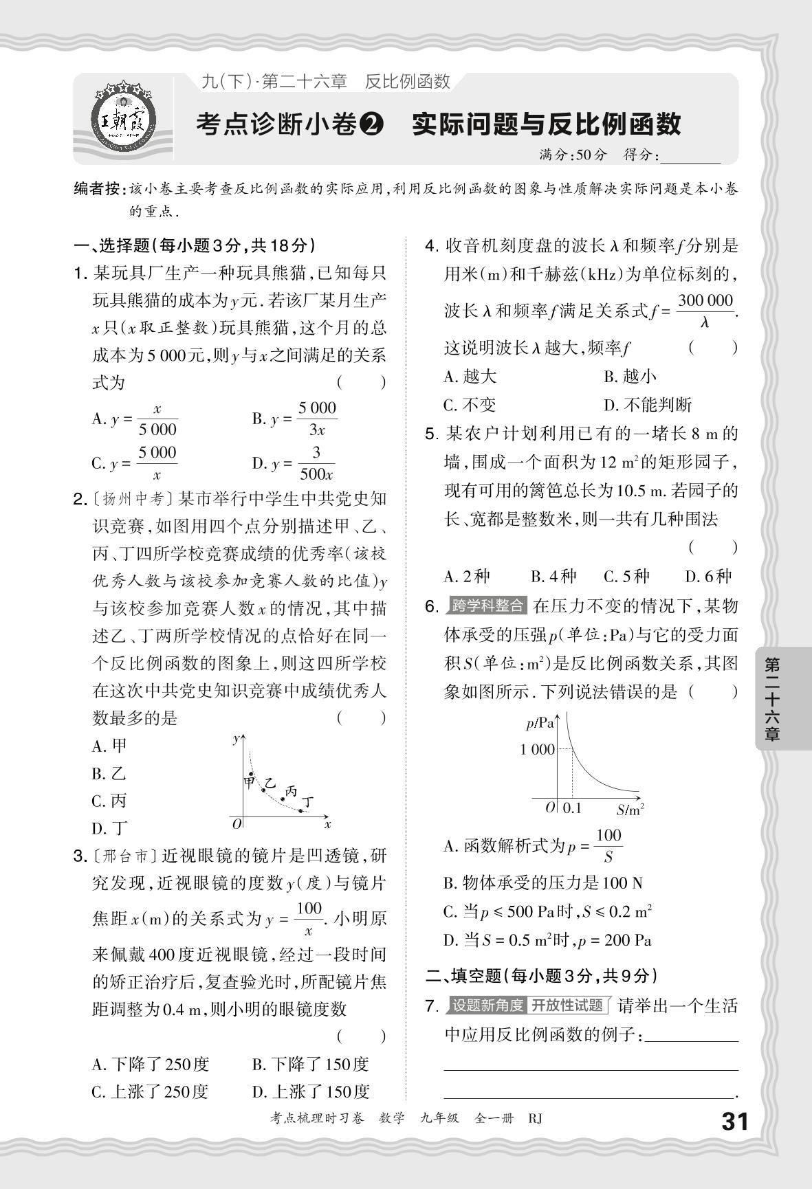 2025下册九年级数学人教版 第二十六章 考点诊断小卷2 实际问题与反比例函数