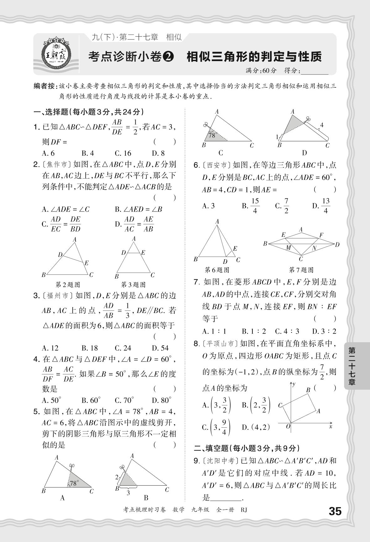 2025下册九年级数学人教版 第二十七章 考点诊断小卷2 相似三角形的判定与性质