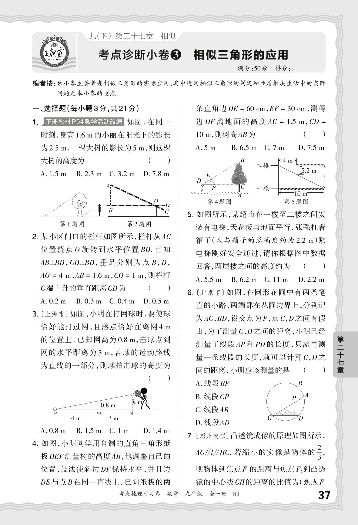 2025下册九年级数学人教版 第二十七章 考点诊断小卷3 相似三角形的应用