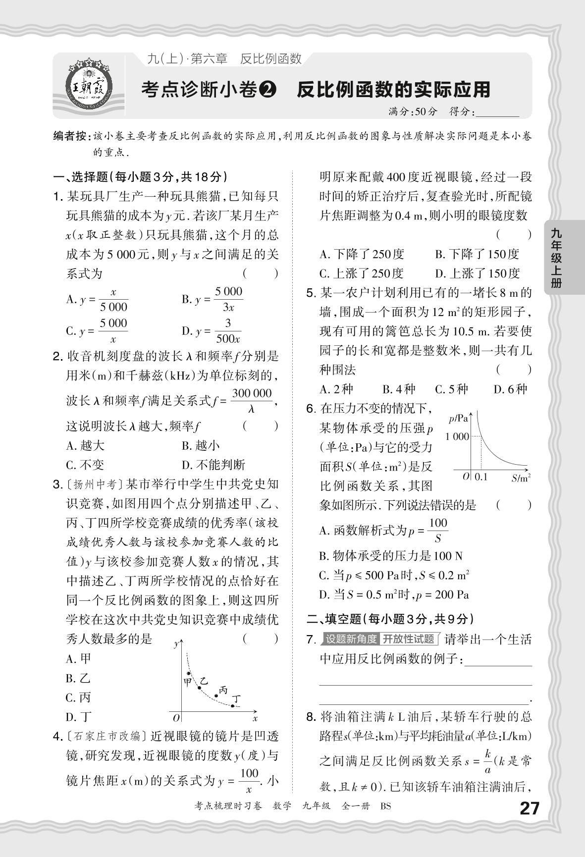 2024上册九年级数学北师版 第六章 考点诊断小卷2 反比例函数的实际应用