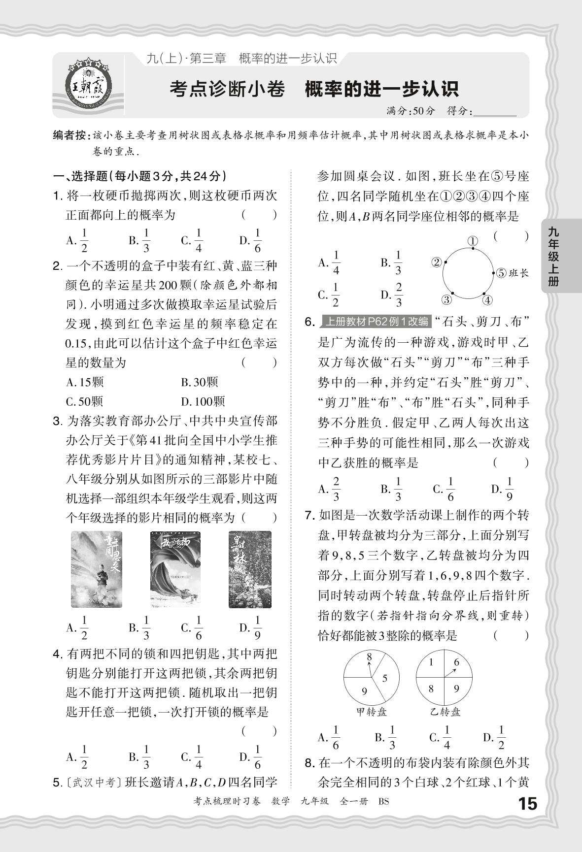 2024上册九年级数学北师版 第三章 考点诊断小卷 概率的进一步认识