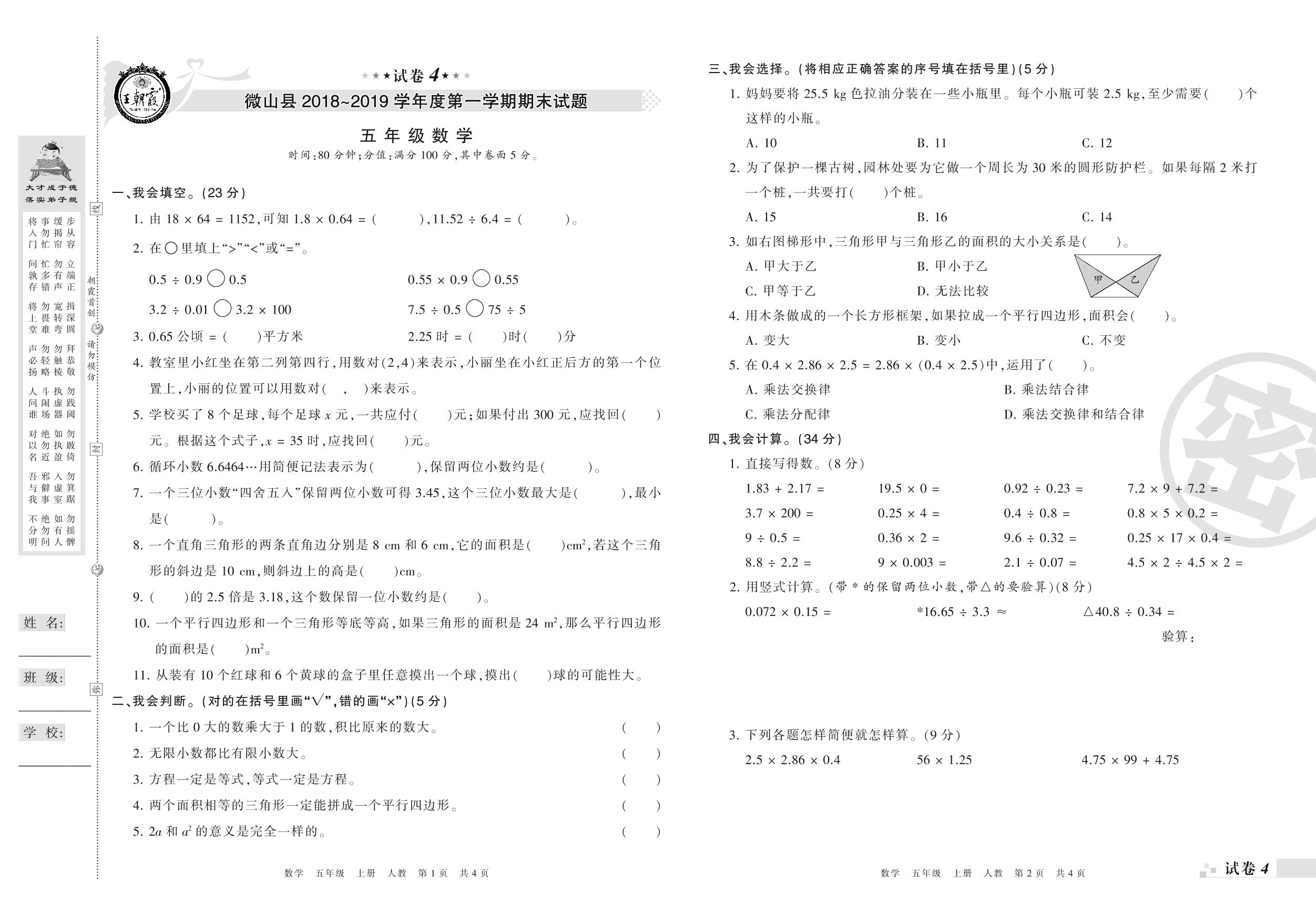2018-2019学年第一学期济宁市微山县五年级数学试卷(人教版)【4】