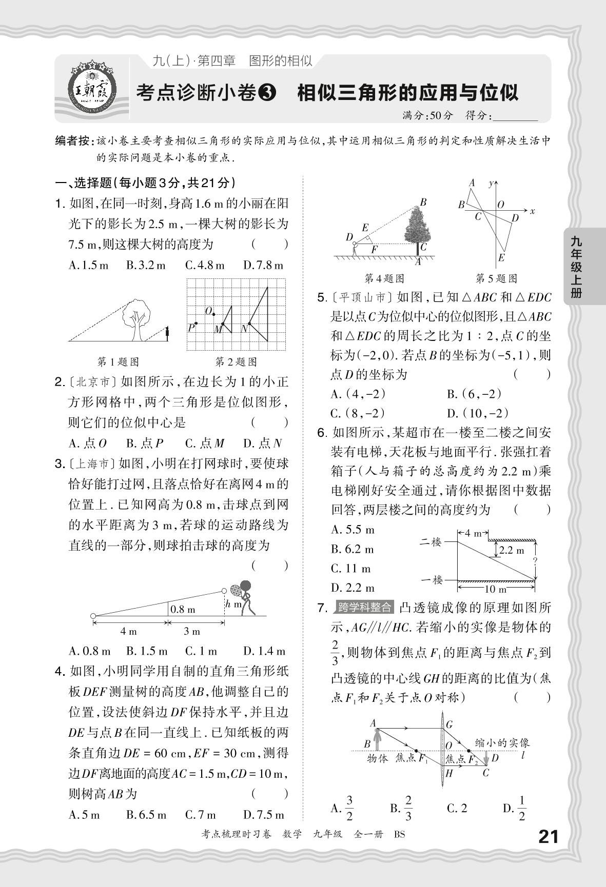 2024上册九年级数学北师版 第四章 考点诊断小卷3 相似三角形的应用与位似